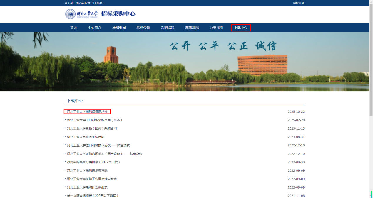 点击招标采购中心网站“下载中心”,选择 “河北工业大学采购项目需求书”,点击下载。依照采购项目需求书的格式,科学合理确定采购需求: